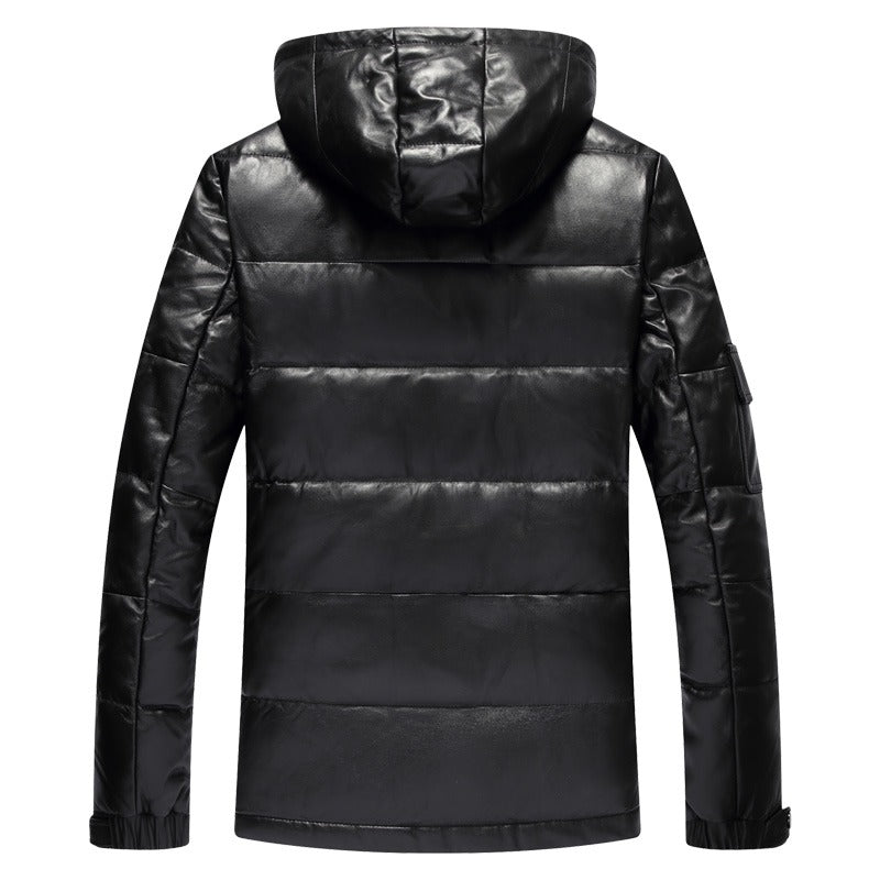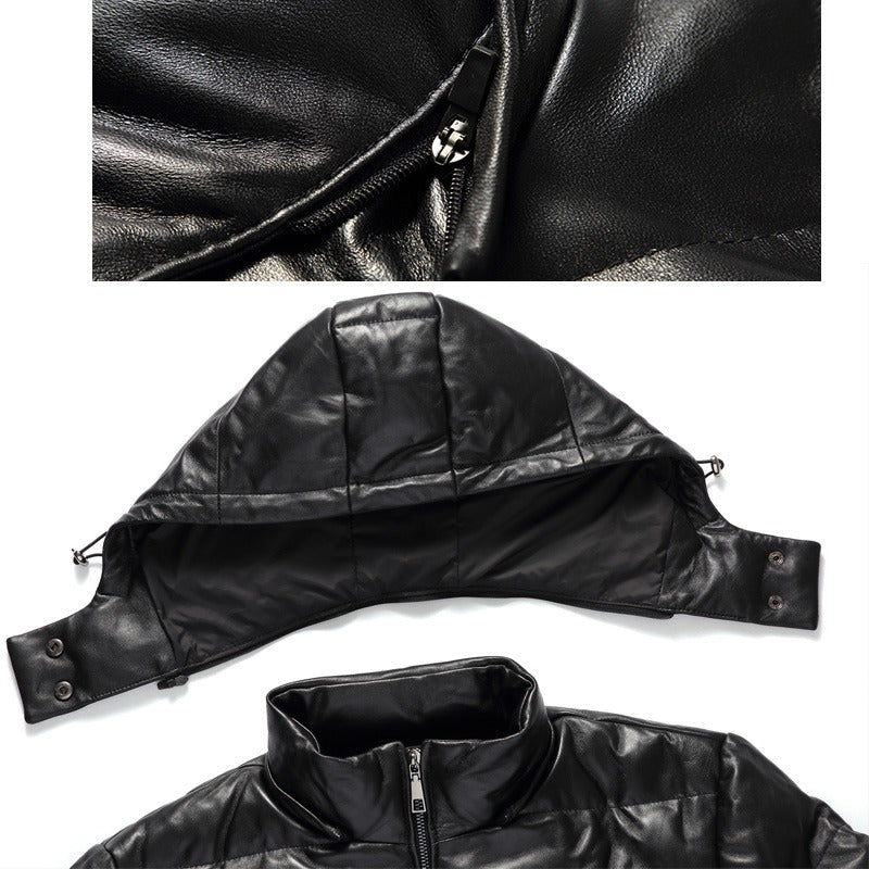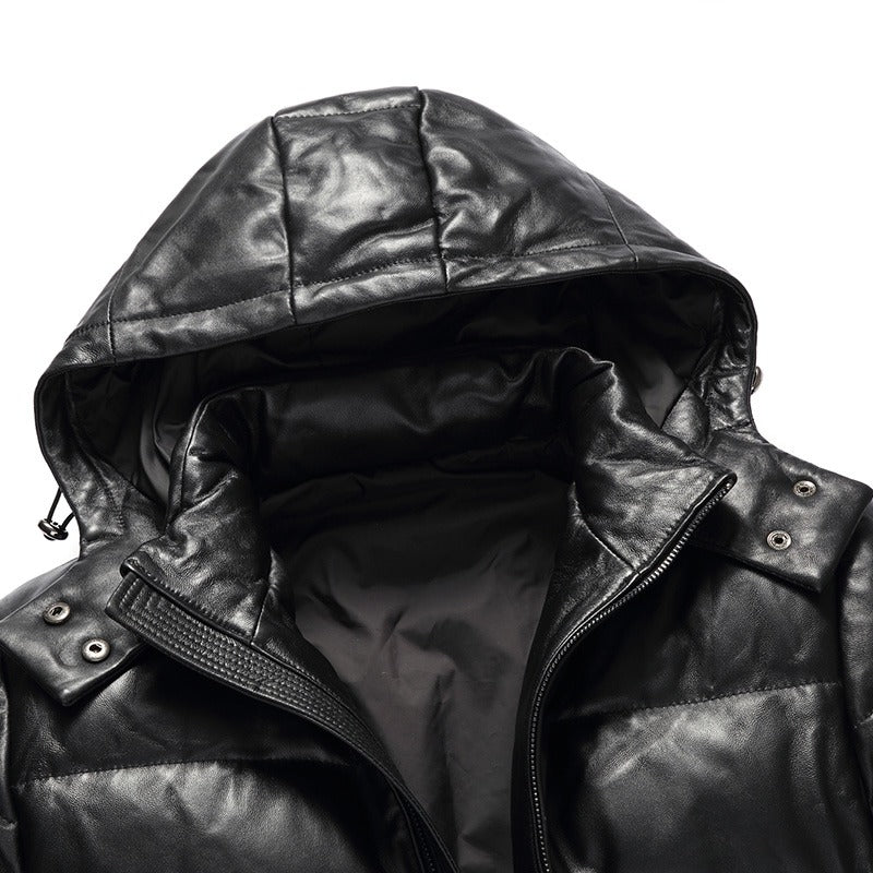 Men's Winter Black Puffer Real Leather Jacket with artificial down. Made with Ultra Premium 100% Real Soft and Supple Lambskin Leather. Mid-Length Jacket with Fur lining on hoodie. Detachable Hoodie by Zipper. Filled with artificial down in for cold weather protection. Great for jacket for casual and party wear.