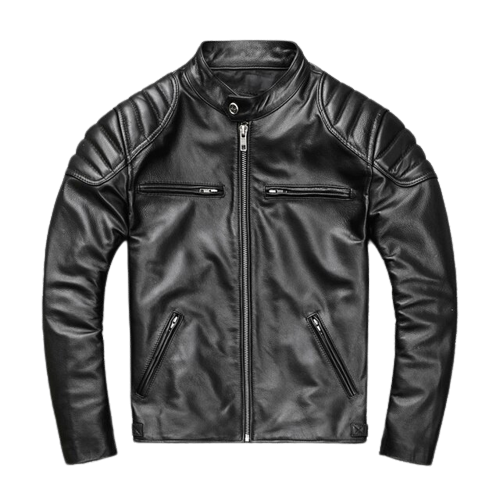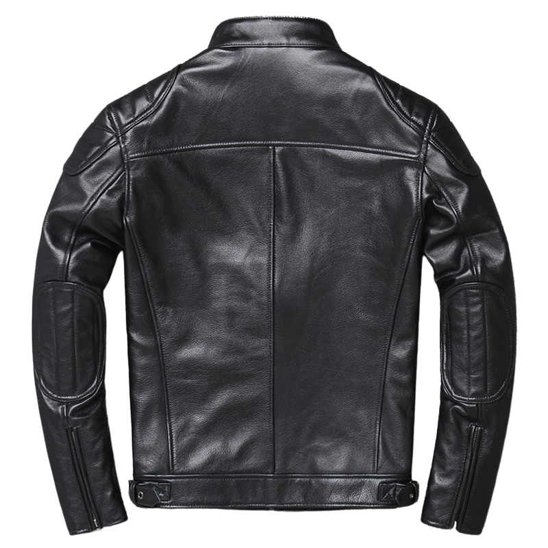 Semi-Casual men's leather jacket with four front pockets. Zippered midsection.  Soft and supple lambskin leather.  Elegant and smooth feel. Patchwork on shoulders. Made with 100% genuine leather.