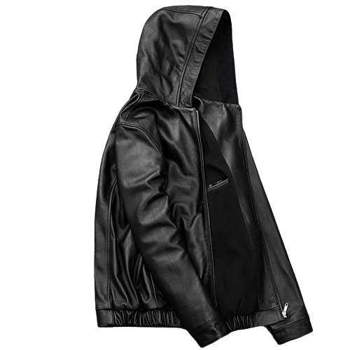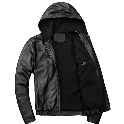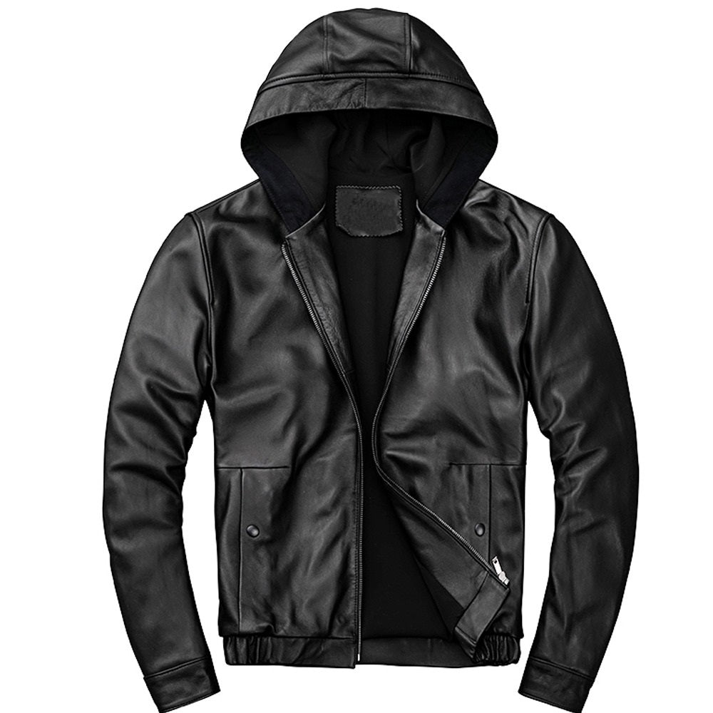 Mens Trendy Genuine Black Leather Hooded Bomber Jacket