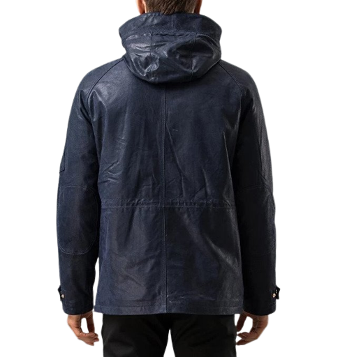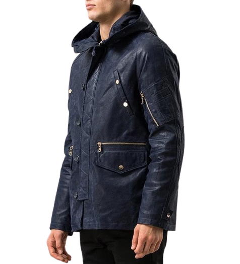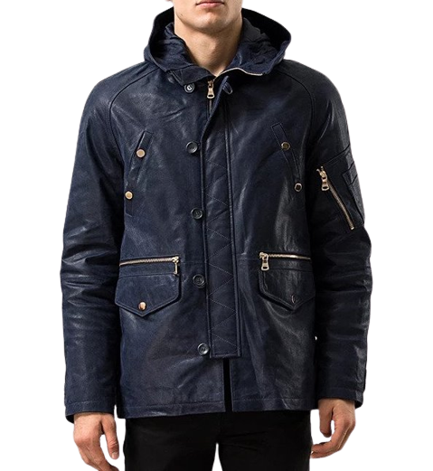 Mens Maverick Front Button Navy Blue Hooded Leather Coat