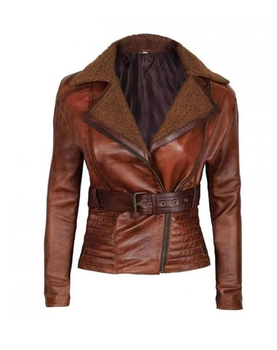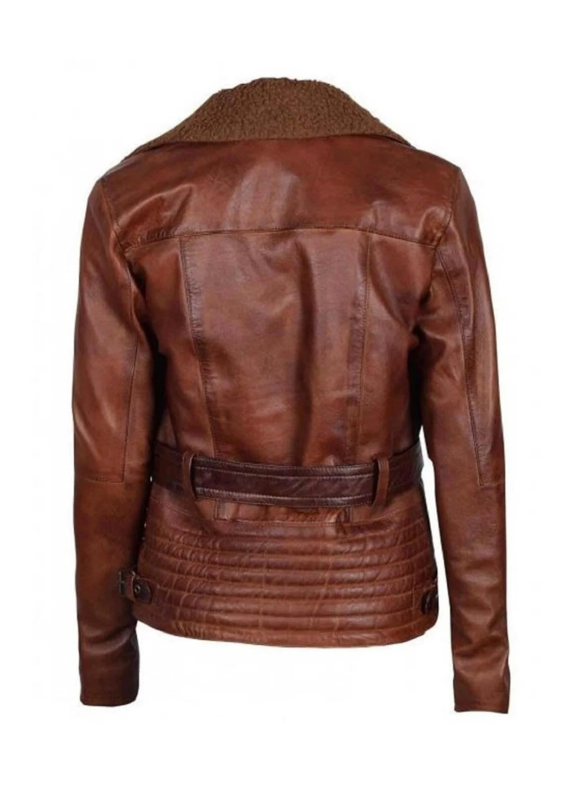 Womens Avery Genuine Lambskin Distressed Leather Fur Collar Biker Jacket